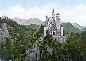 Das an ein Märchenschloss erinnernde Schloss Neuschwanstein liegt in Schwangau bei Füssen am Rande der Alpen. Der etwas exzentrische Ludwig II., seit 1864 König von Bayern, ließ die Burg nach dem Vorbild mittelalterlicher Ritterburgen und seinen Vorstellungen von Bühnenbilder der Opern seines Freundes Richard Wagner errichten. Im Jahre 1880 war Richtfest für den Palas, der 1884 bezogen wurde.